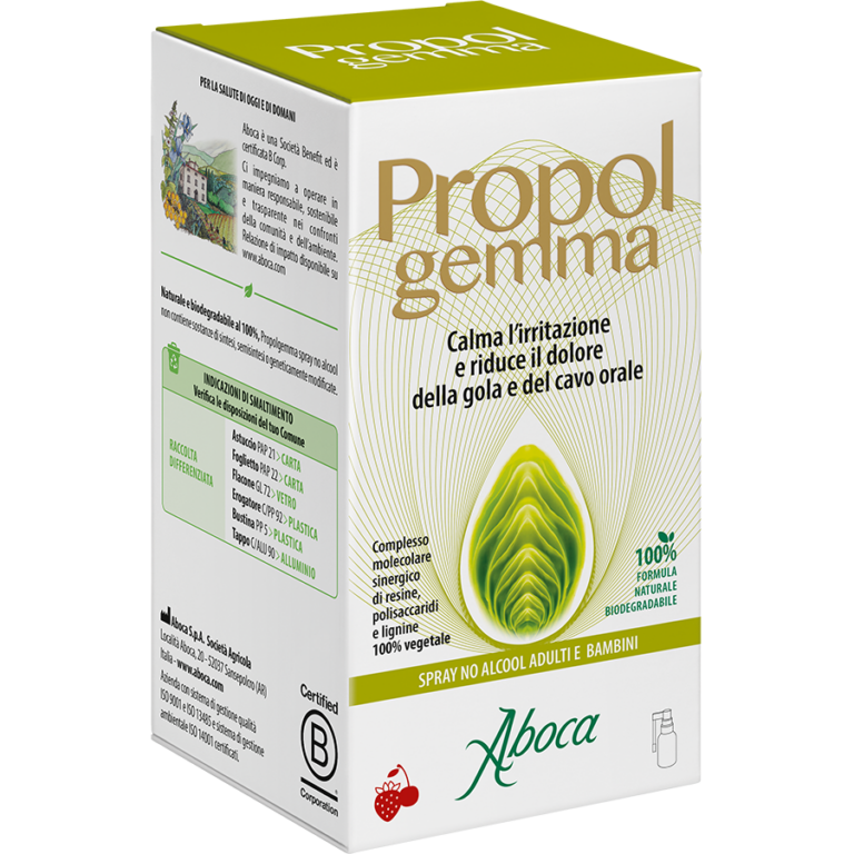 Grazie a un particolare processo estrattivo multifrazione, Propolgemma si caratterizza per la presenza dei componenti principali tipici della propoli uniti a composti funzionali del tessuto vegetale della gemma di pioppo. La ricerca Aboca ha sviluppato così un complesso molecolare con particolari capacità di protezione delle mucose del cavo orofaringeo.